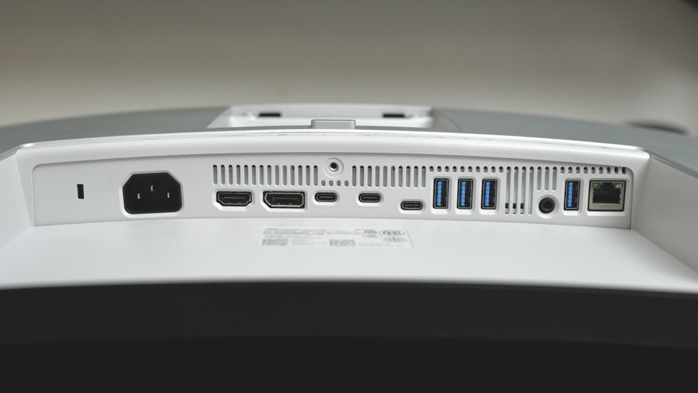 底面のくぼみには、このモニター大きな特徴の一つでもある多くの端子が揃っています。