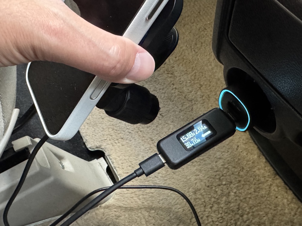 付属の40W充電器をシガーソケットに装着し、iPhone17ProMAXの充電を10%以下にしてから、W数を測定してみました。