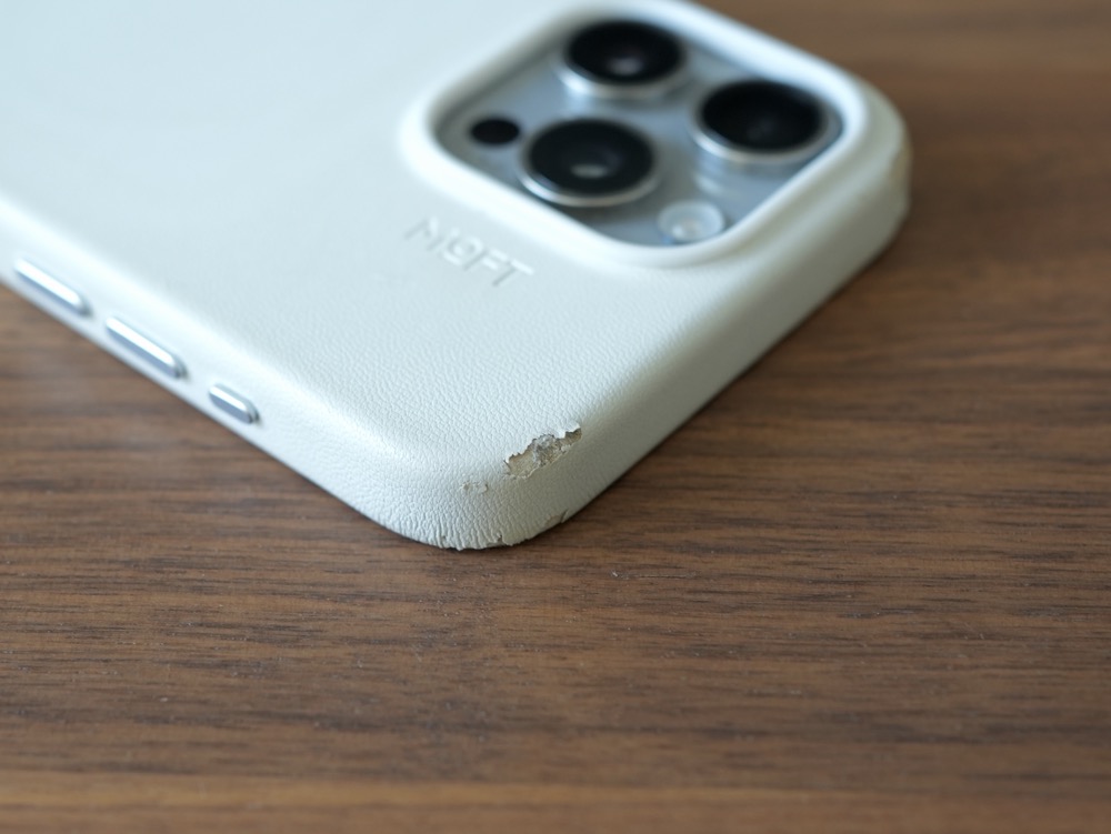 MOVASは傷や摩擦に強いと前述しましたが、アスファルトなどへの落下や、毎日の使用で表面は剥がれます!